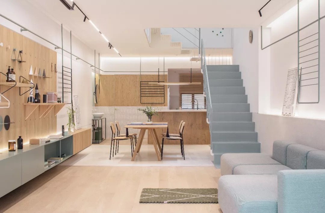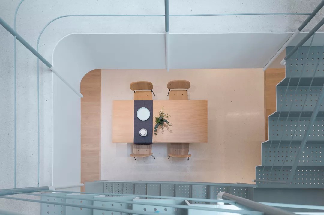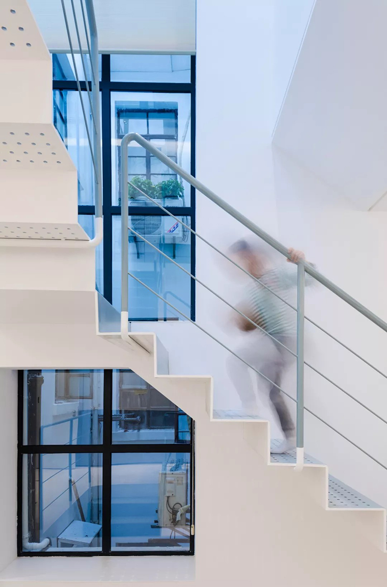 同时楼梯围绕着自然光和天井,循序而上。
