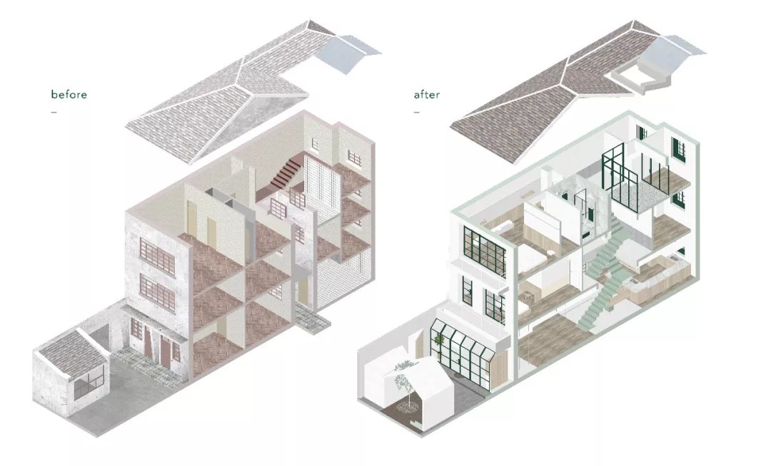 花了4个月左右的设计时间,先把隔间打通,格局定下来:一楼用作院子、客厅、厨房和餐厅;二楼主要为储藏室;三楼是一家人住的卧室。
