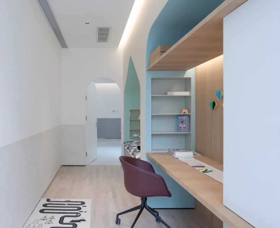 孩子的书桌和床也利用设计连在一起,