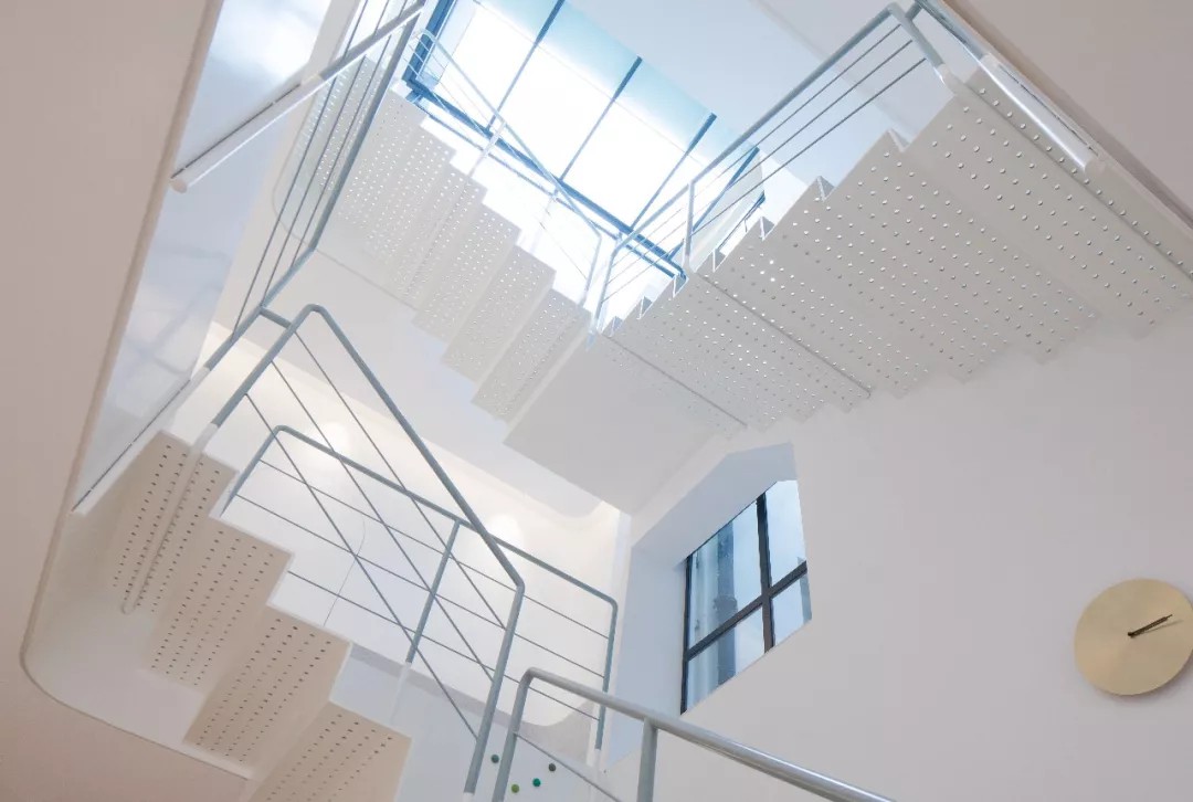 室内的钢板楼梯穿孔以后,阳光从天窗泄下来,