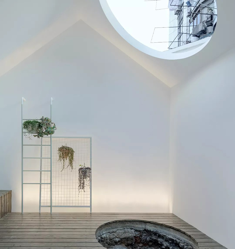 院子顶部留了一个圆弧,阳光通过洞射进里面,这也是设计的一部分。