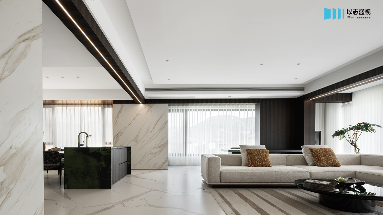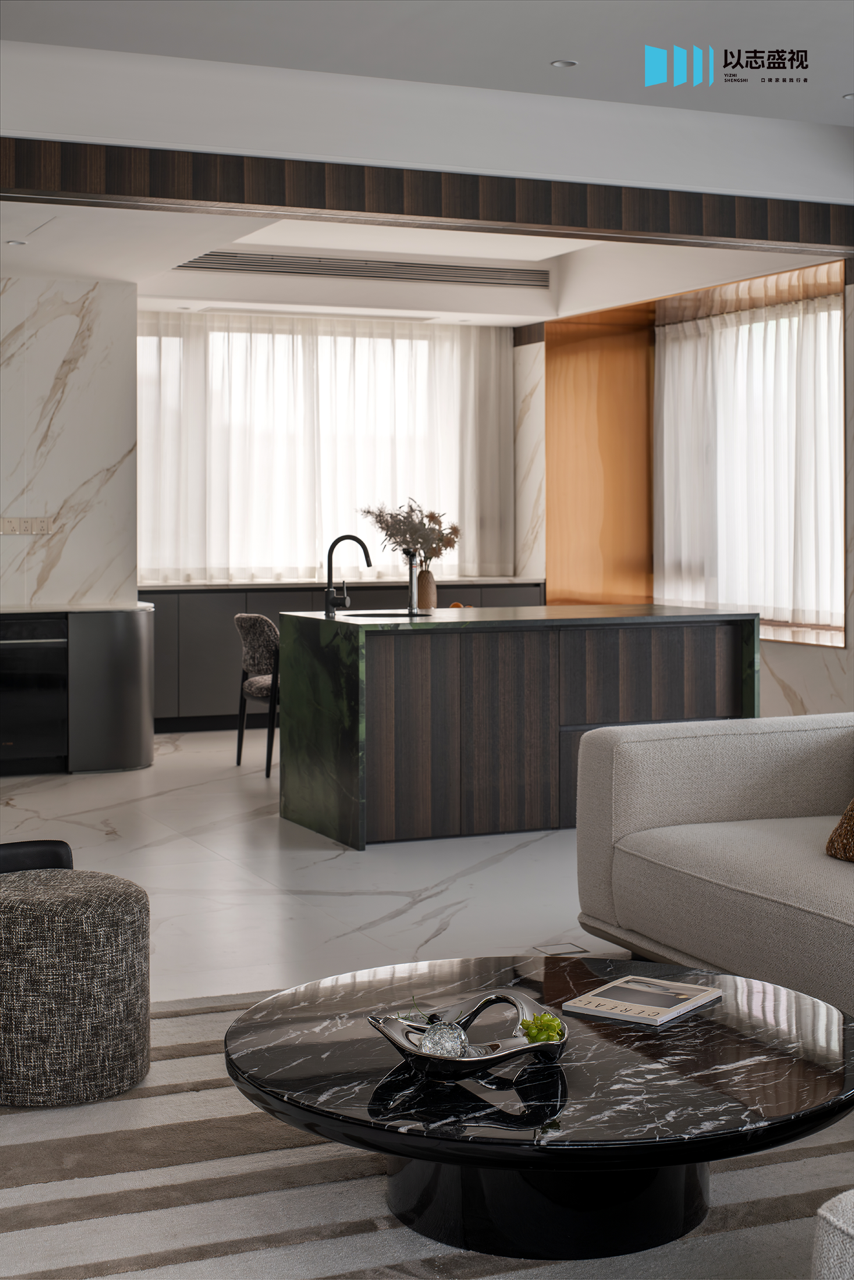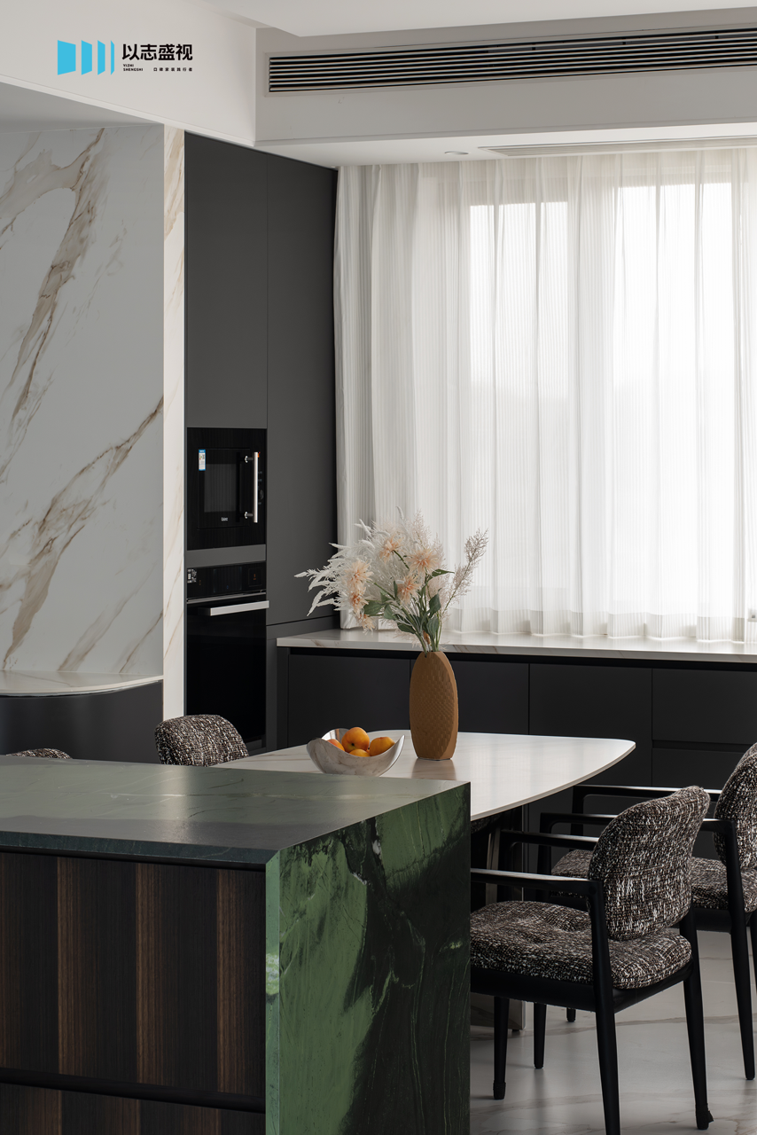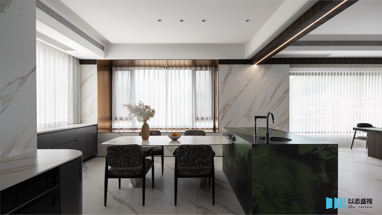 ①100㎡公区规划,客餐厅、阳台“双岛台”布局,打造联系紧密的家庭互动区域。