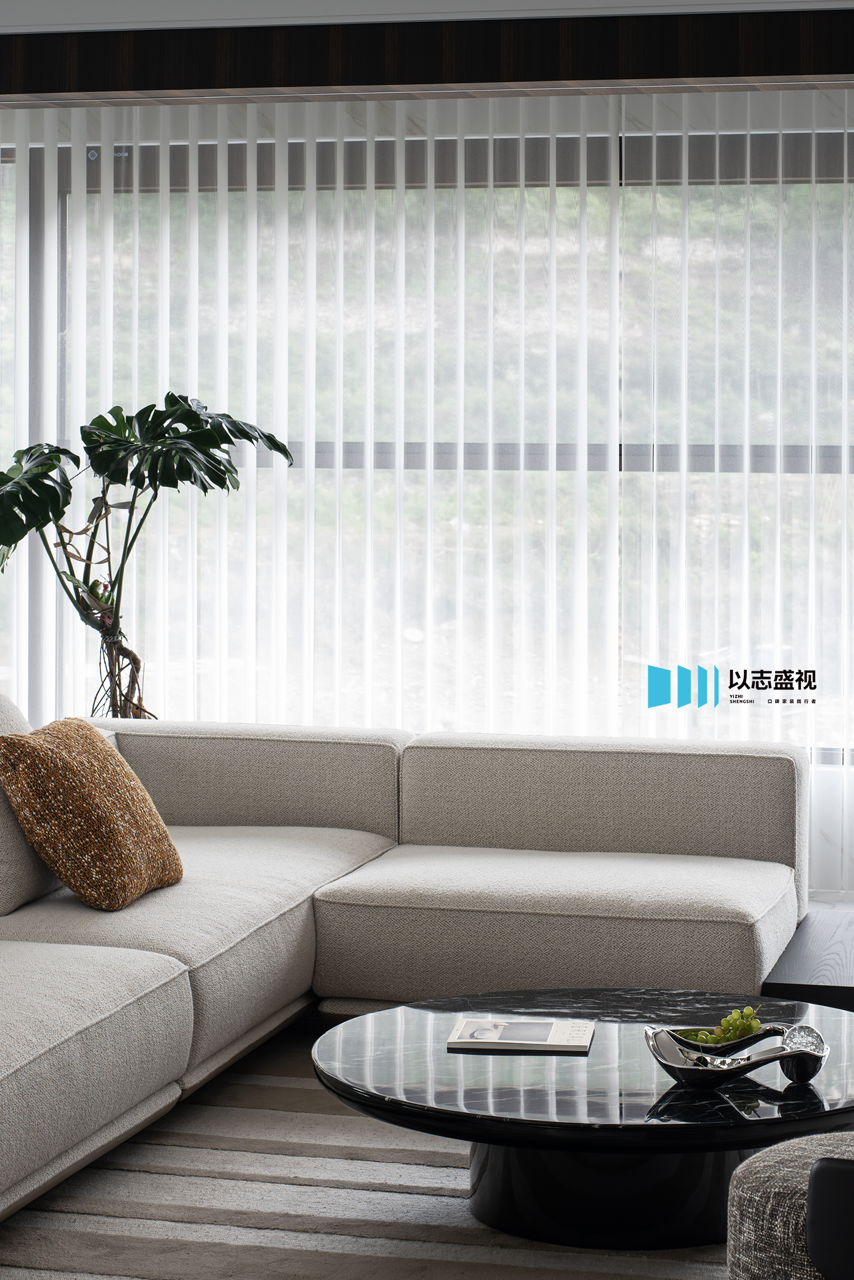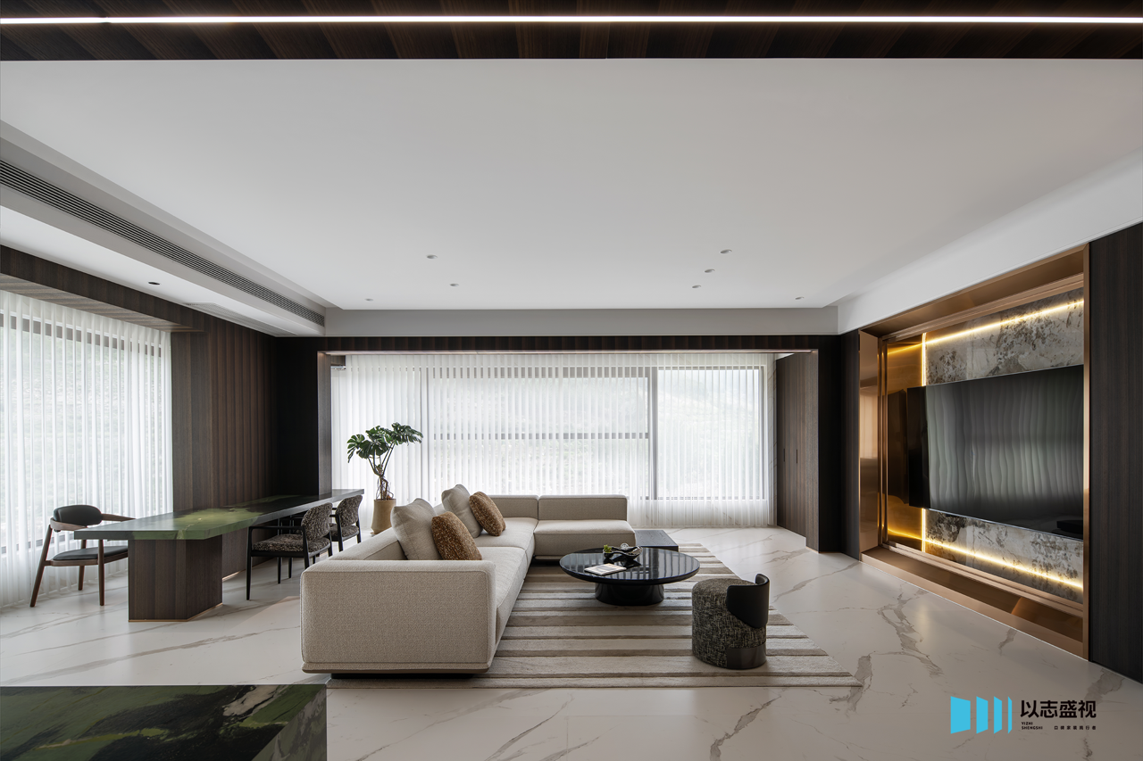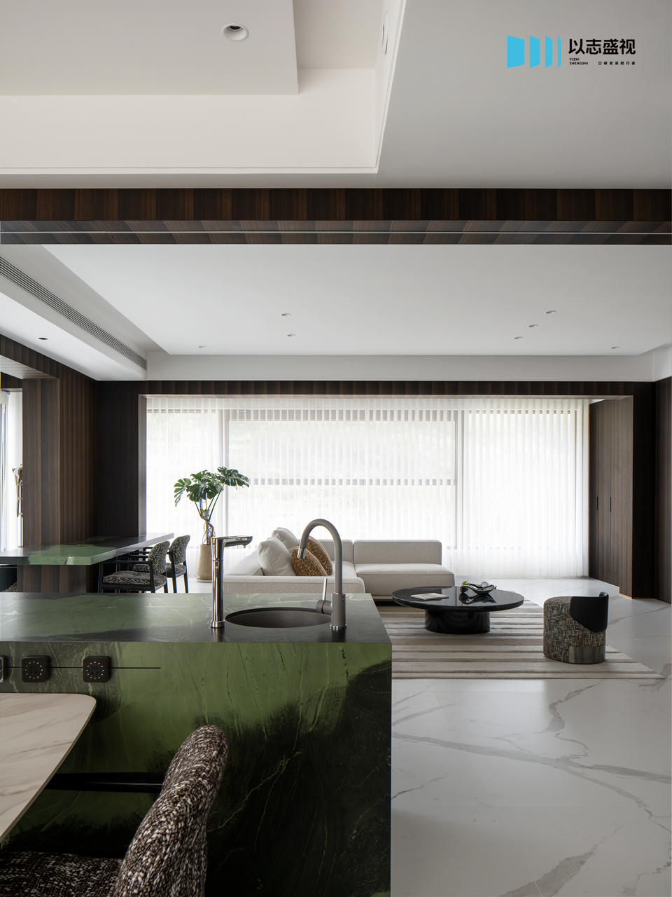 ①100㎡公区规划,客餐厅、阳台“双岛台”布局,打造联系紧密的家庭互动区域。