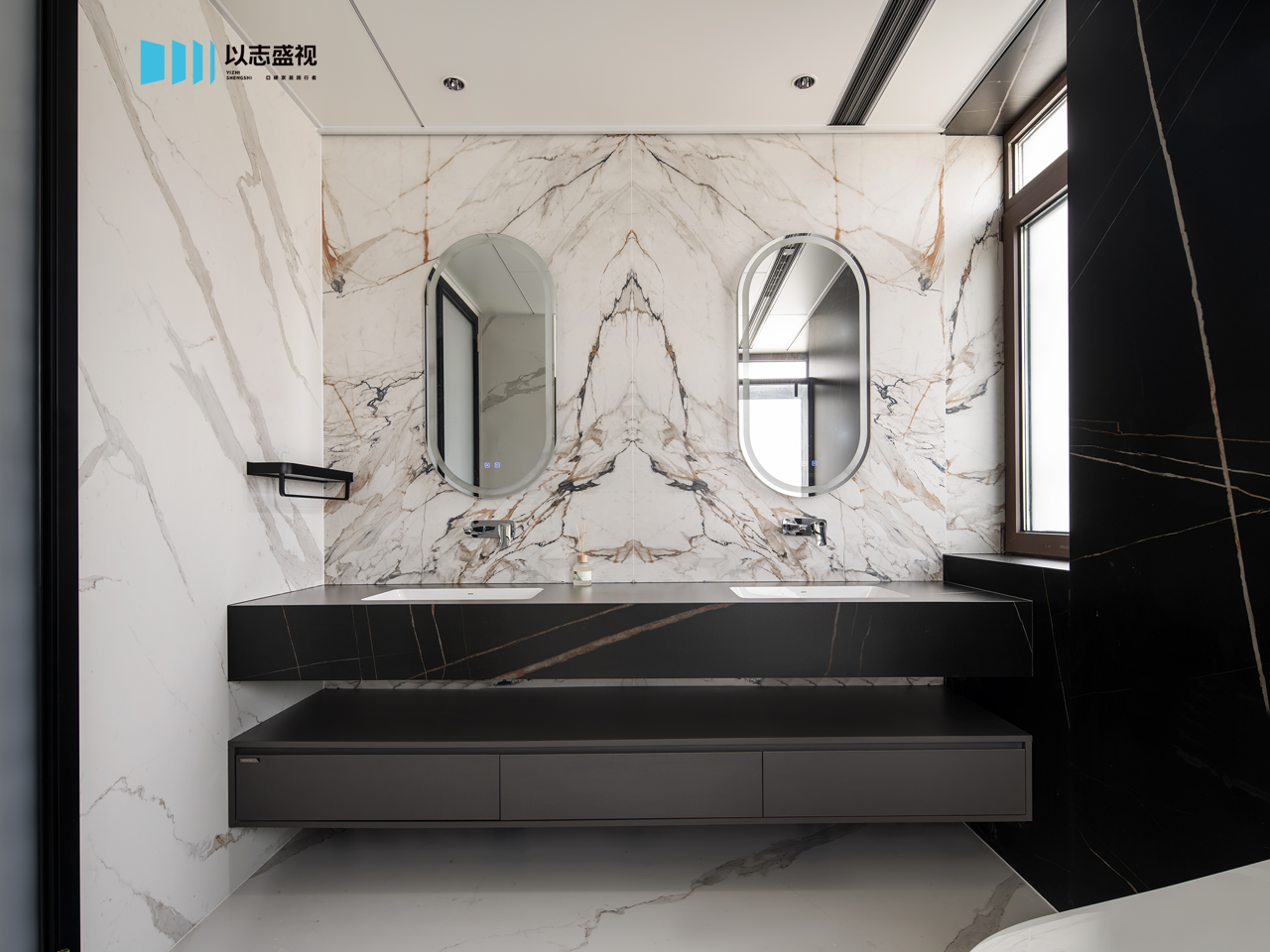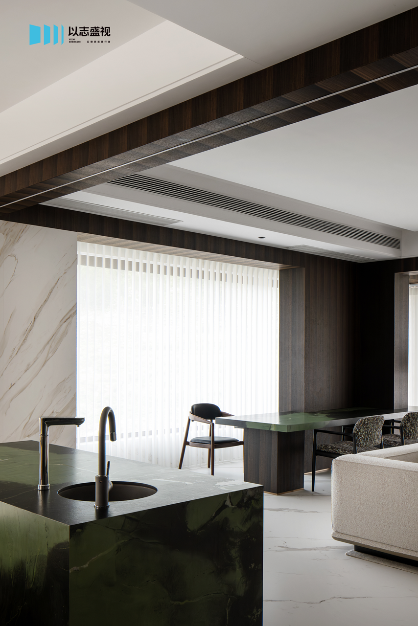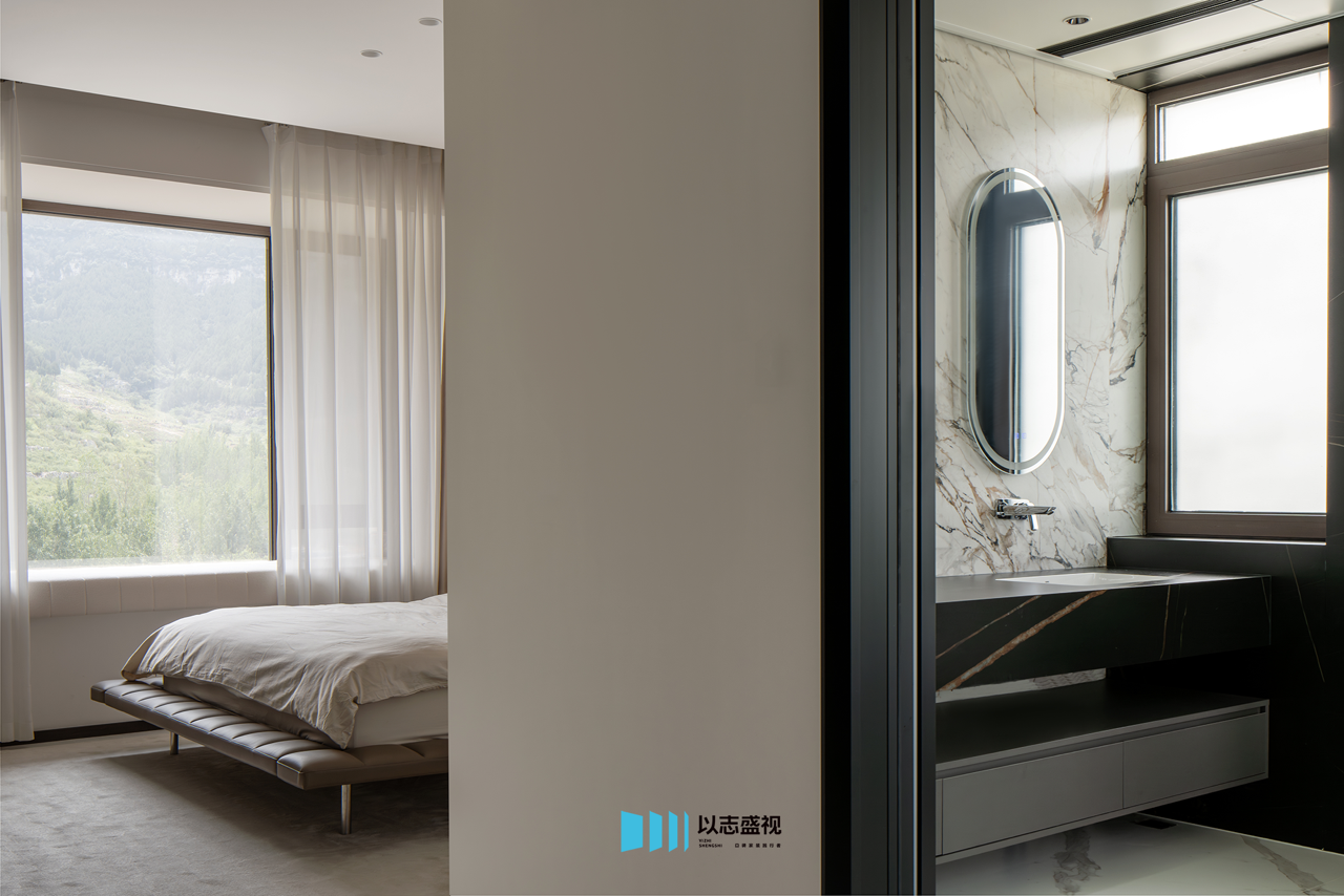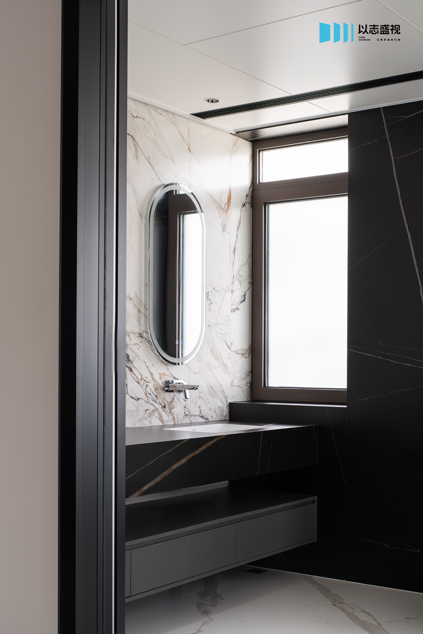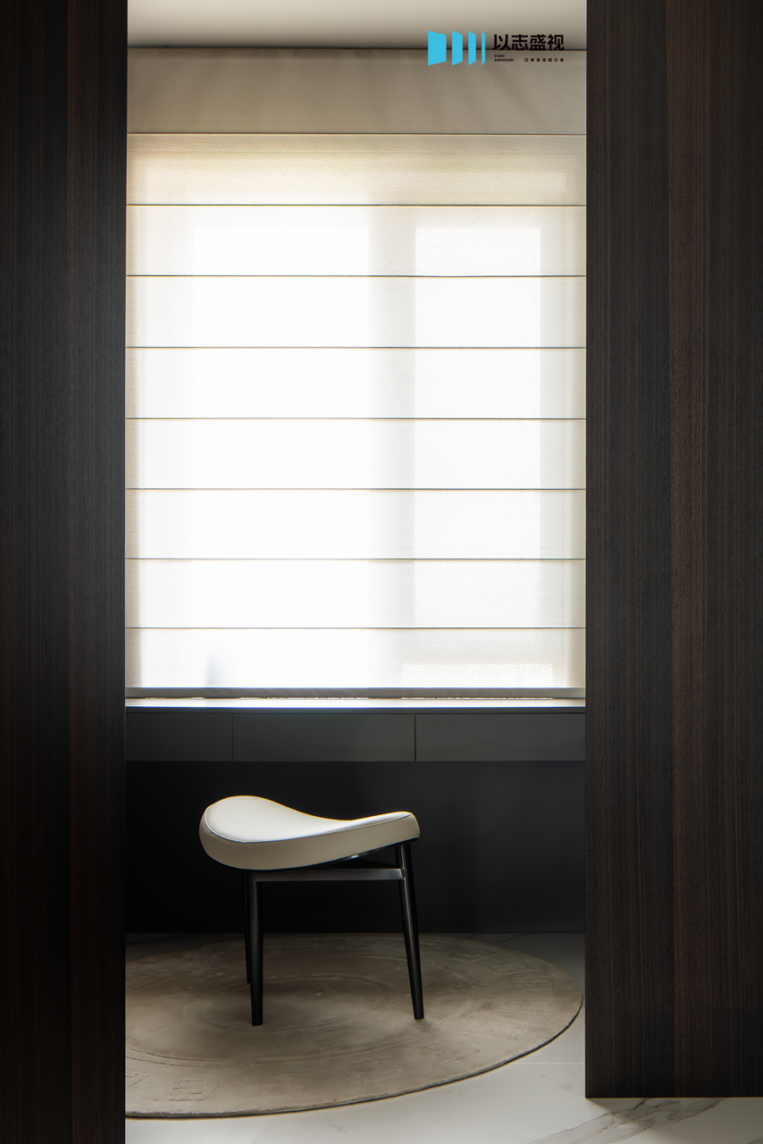 北侧两个卧室打通,并入主卧室作为衣帽间。走进双开门后,是聚焦生活品质的功能套间。