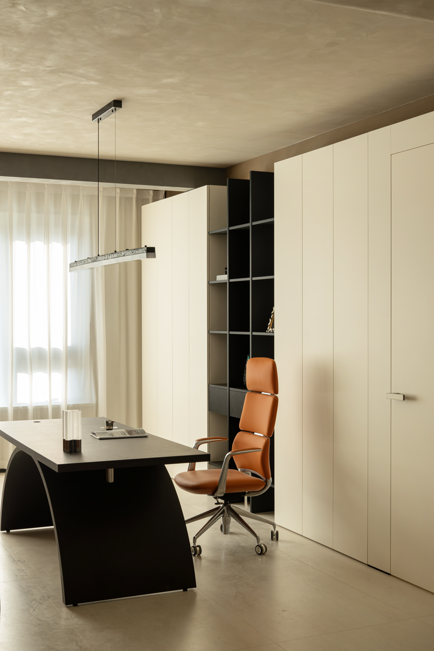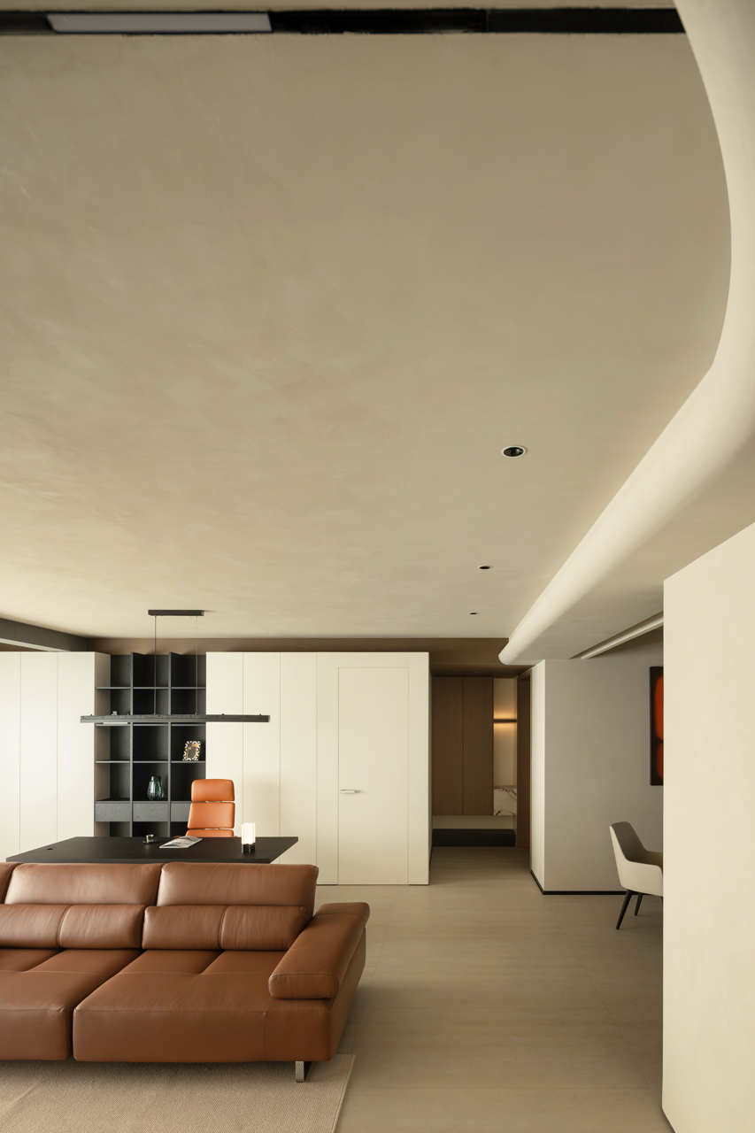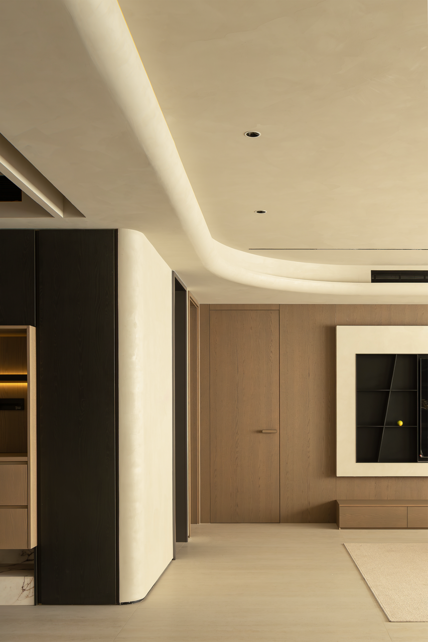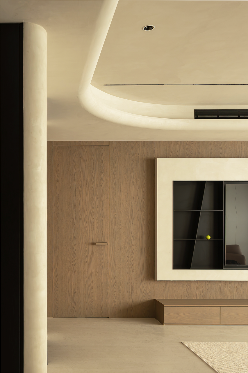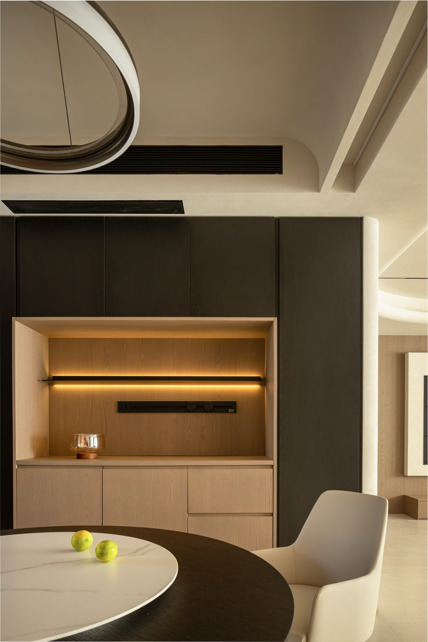 用梁去定义高度,柜体顶部脱开,与吊顶之间就有了呼吸的空间。