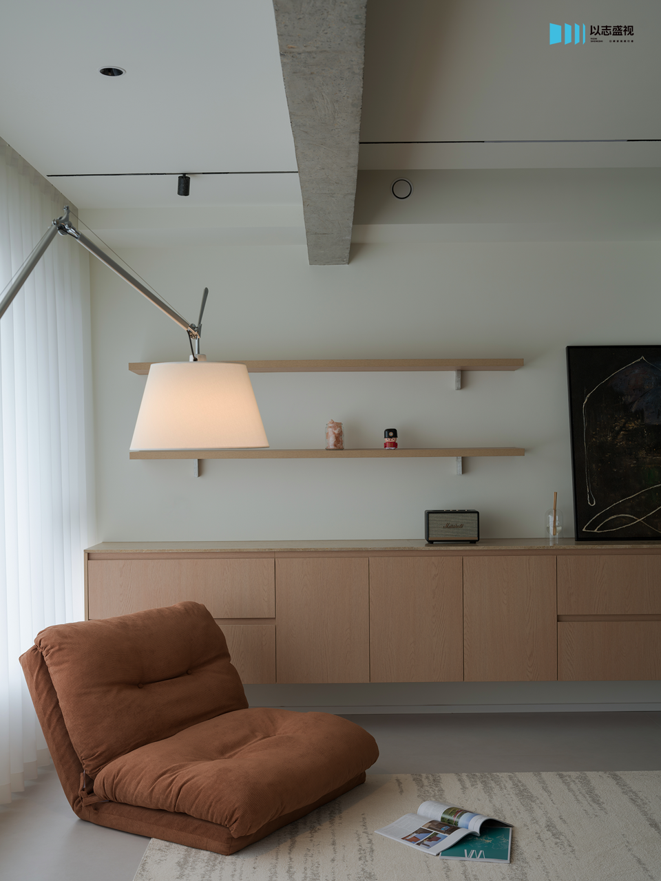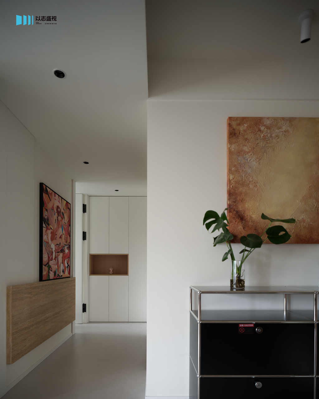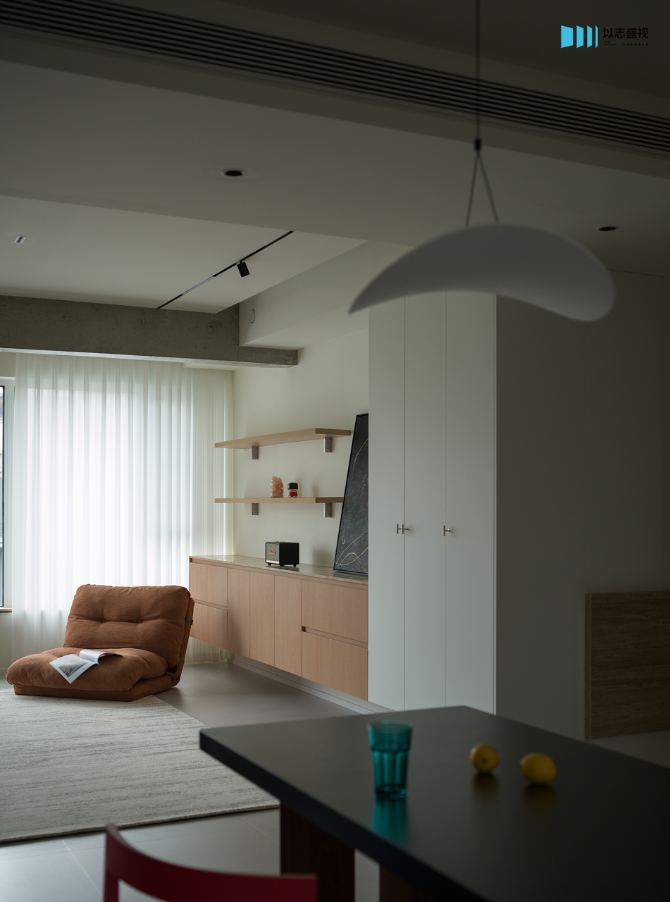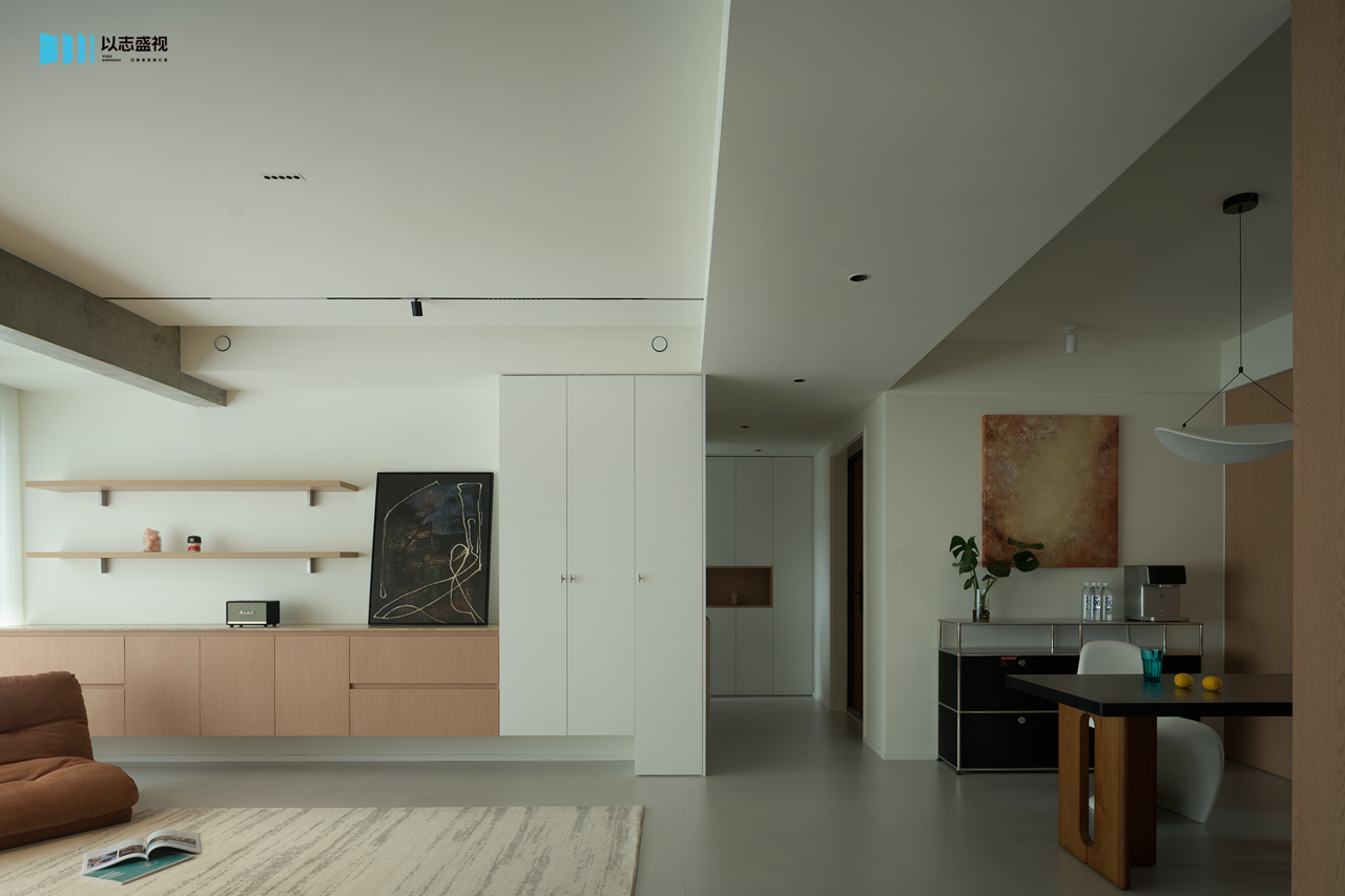 两侧背景墙分别是满墙功能柜与悬浮柜、隔板,功能分区清晰而联系,有盈无溢,划下动人的留白。