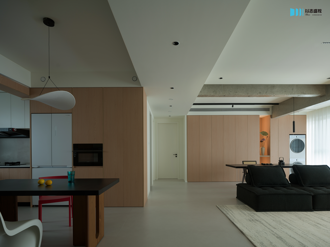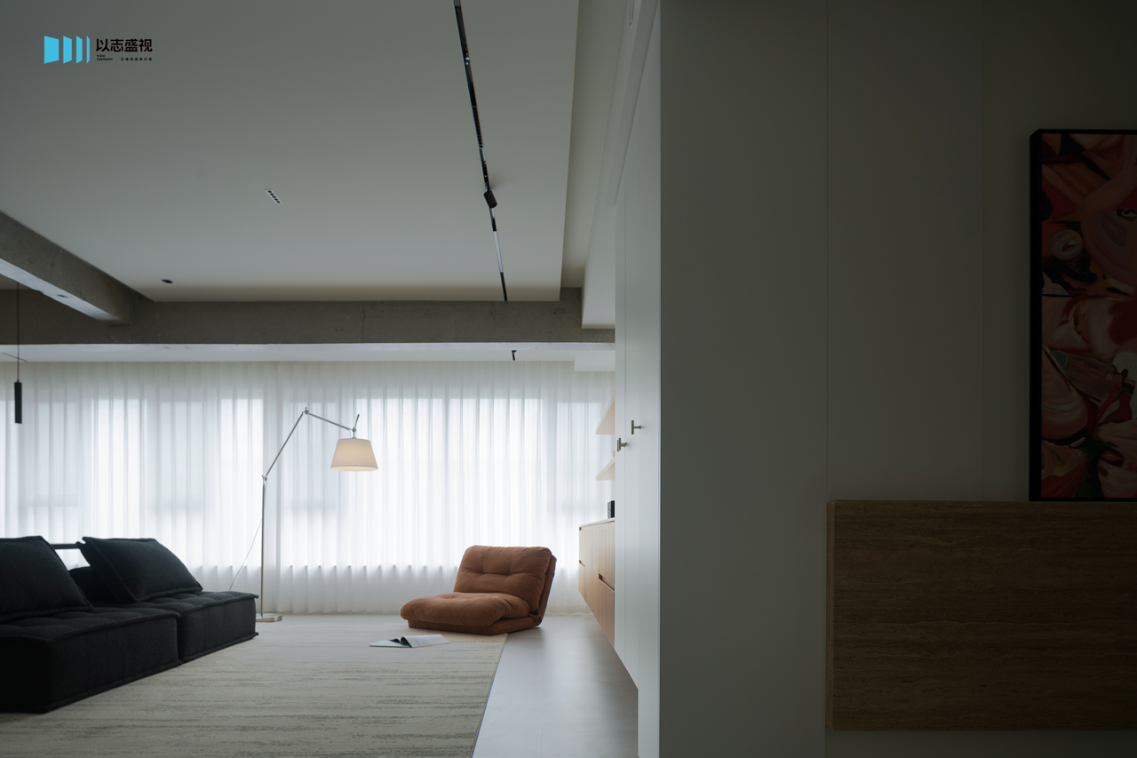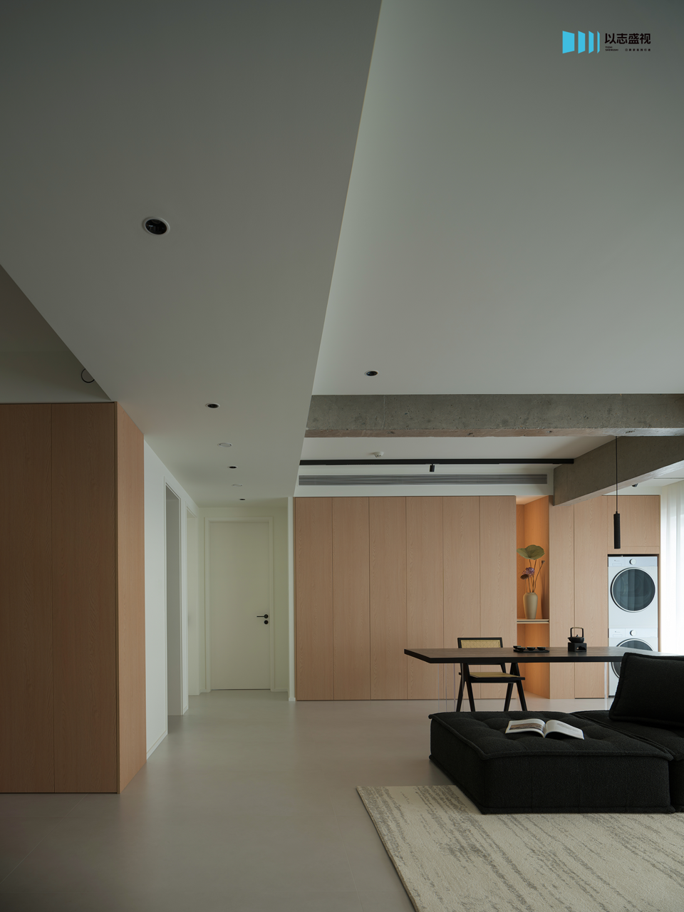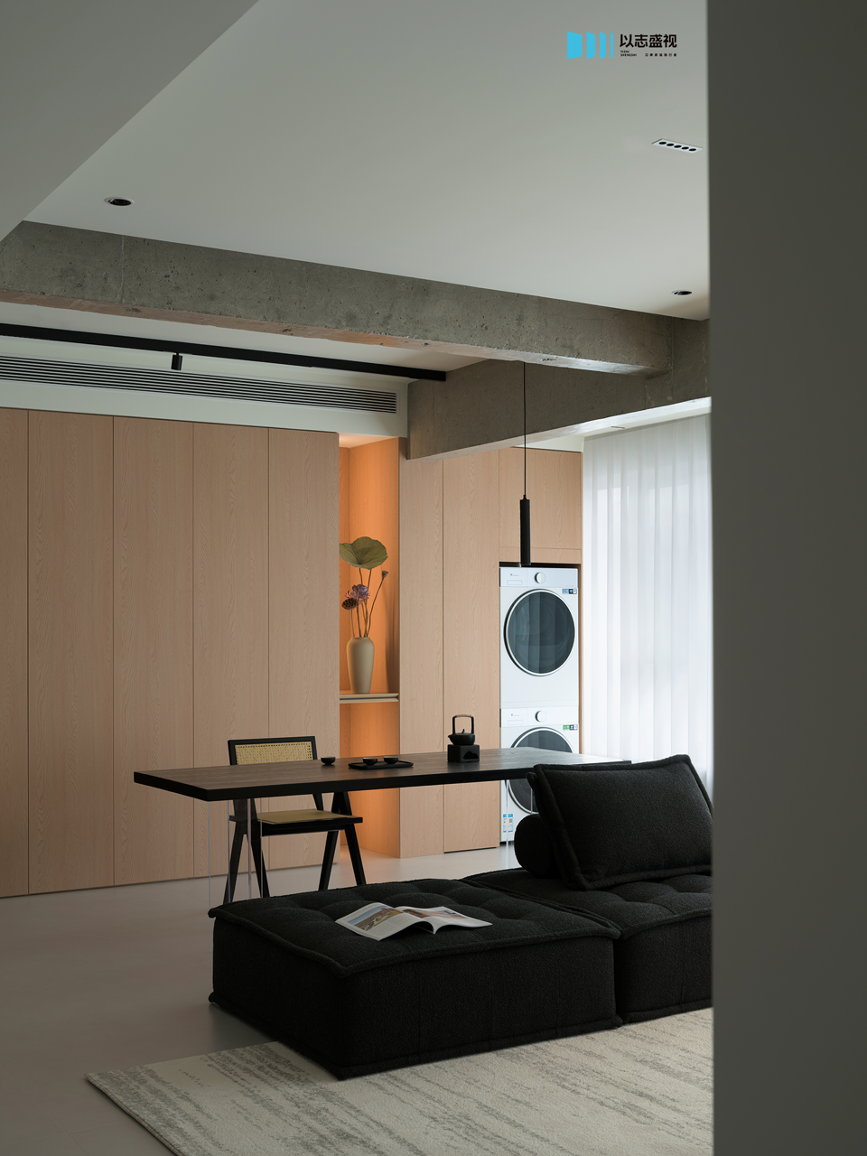 两侧背景墙分别是满墙功能柜与悬浮柜、隔板,功能分区清晰而联系,有盈无溢,划下动人的留白。
