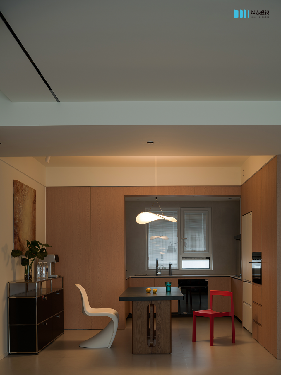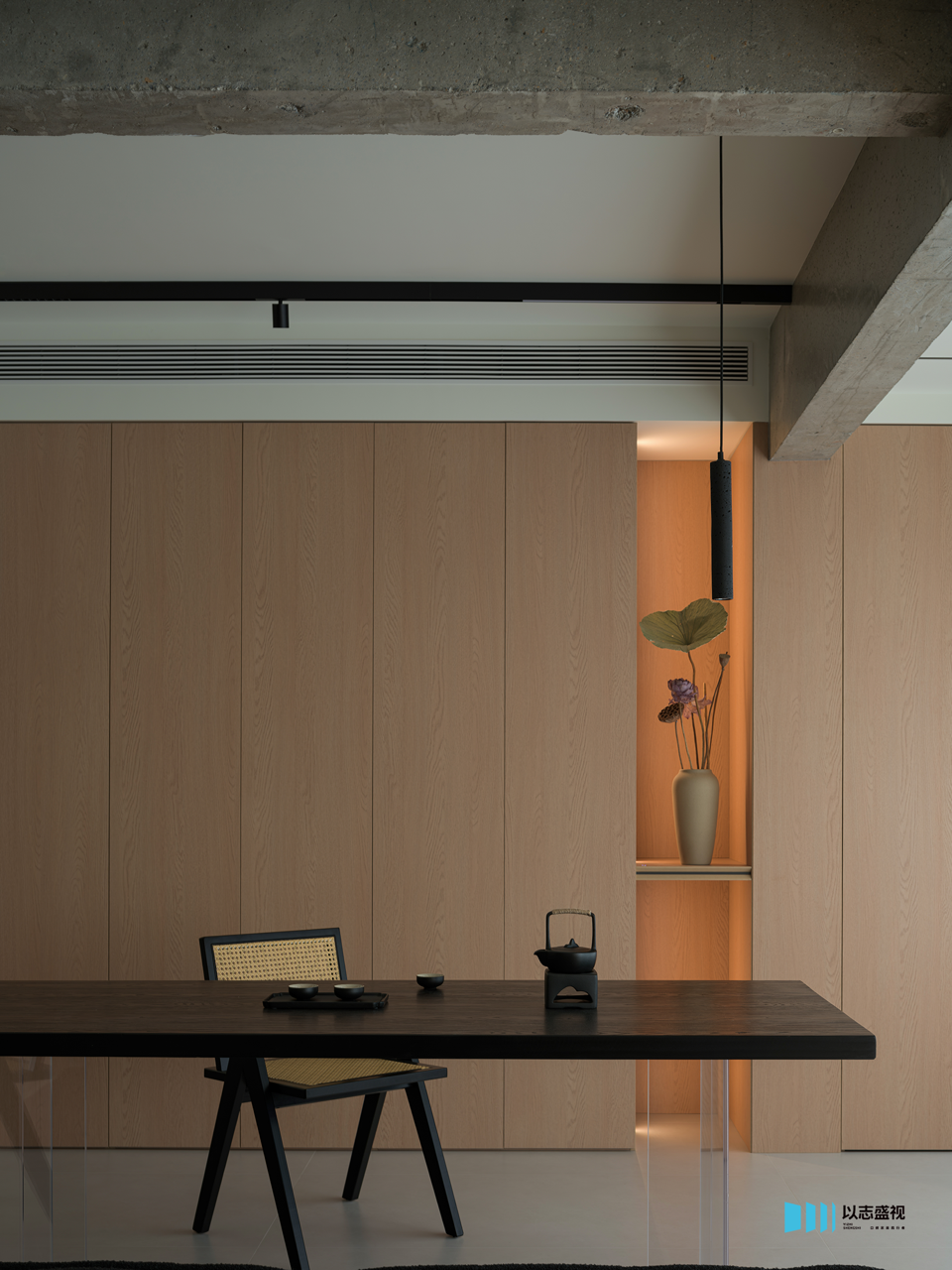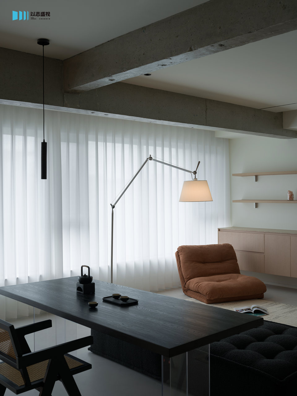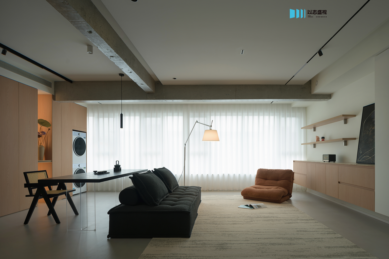 两侧背景墙分别是满墙功能柜与悬浮柜、隔板,功能分区清晰而联系,有盈无溢,划下动人的留白。