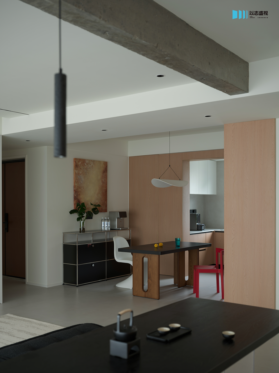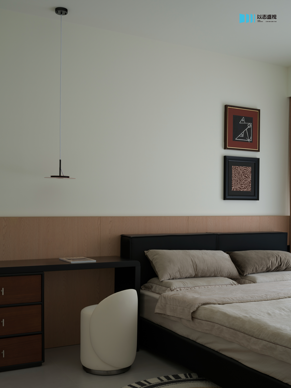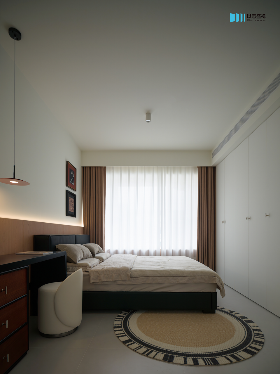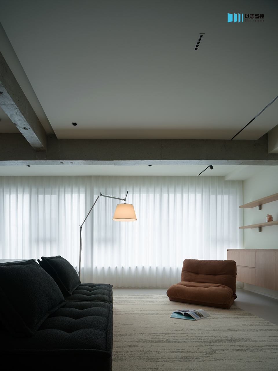 两侧背景墙分别是满墙功能柜与悬浮柜、隔板,功能分区清晰而联系,有盈无溢,划下动人的留白。