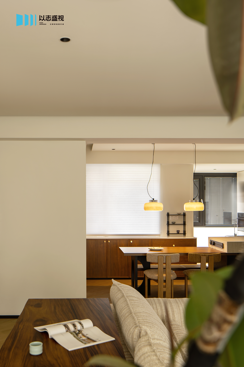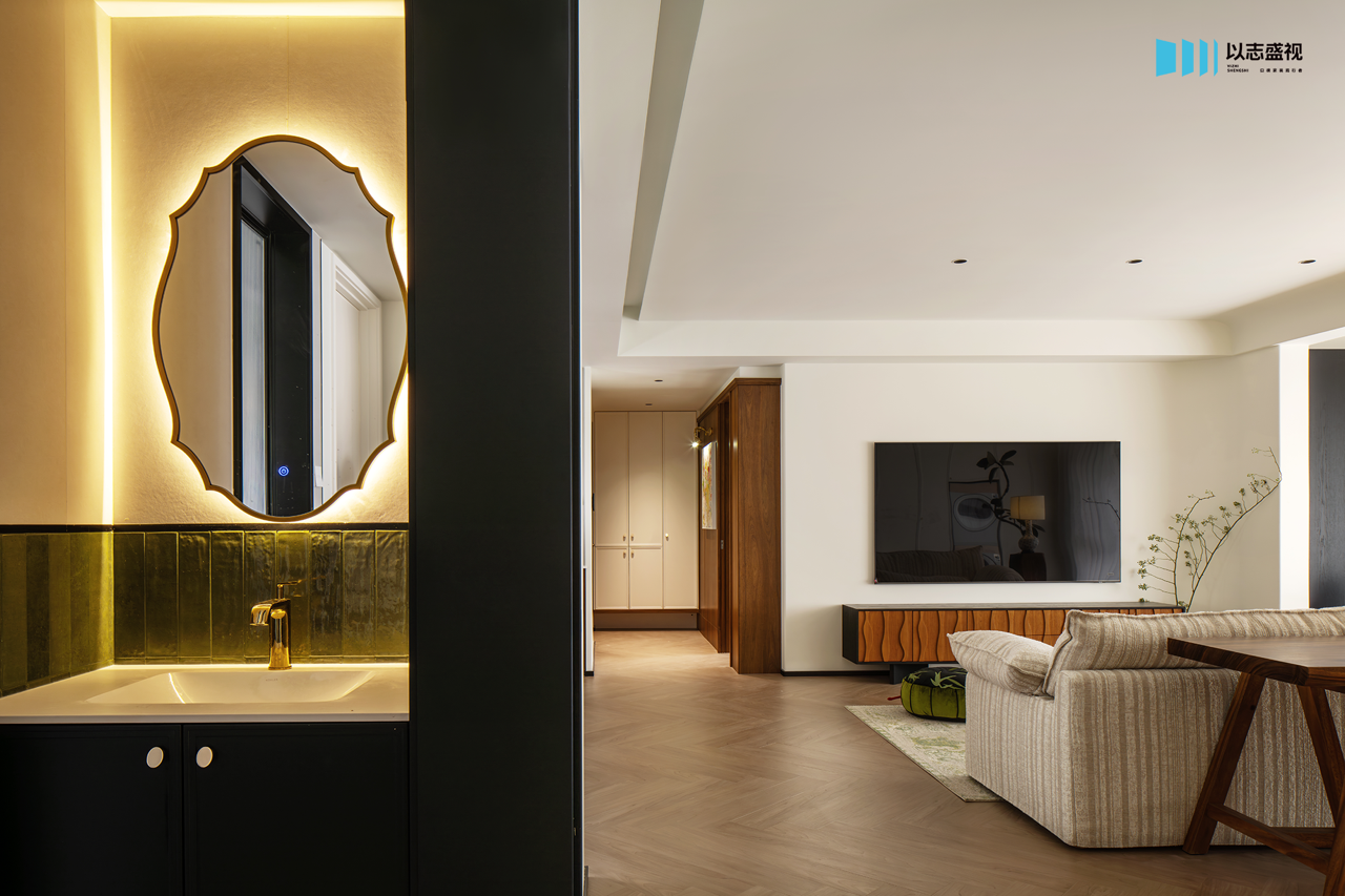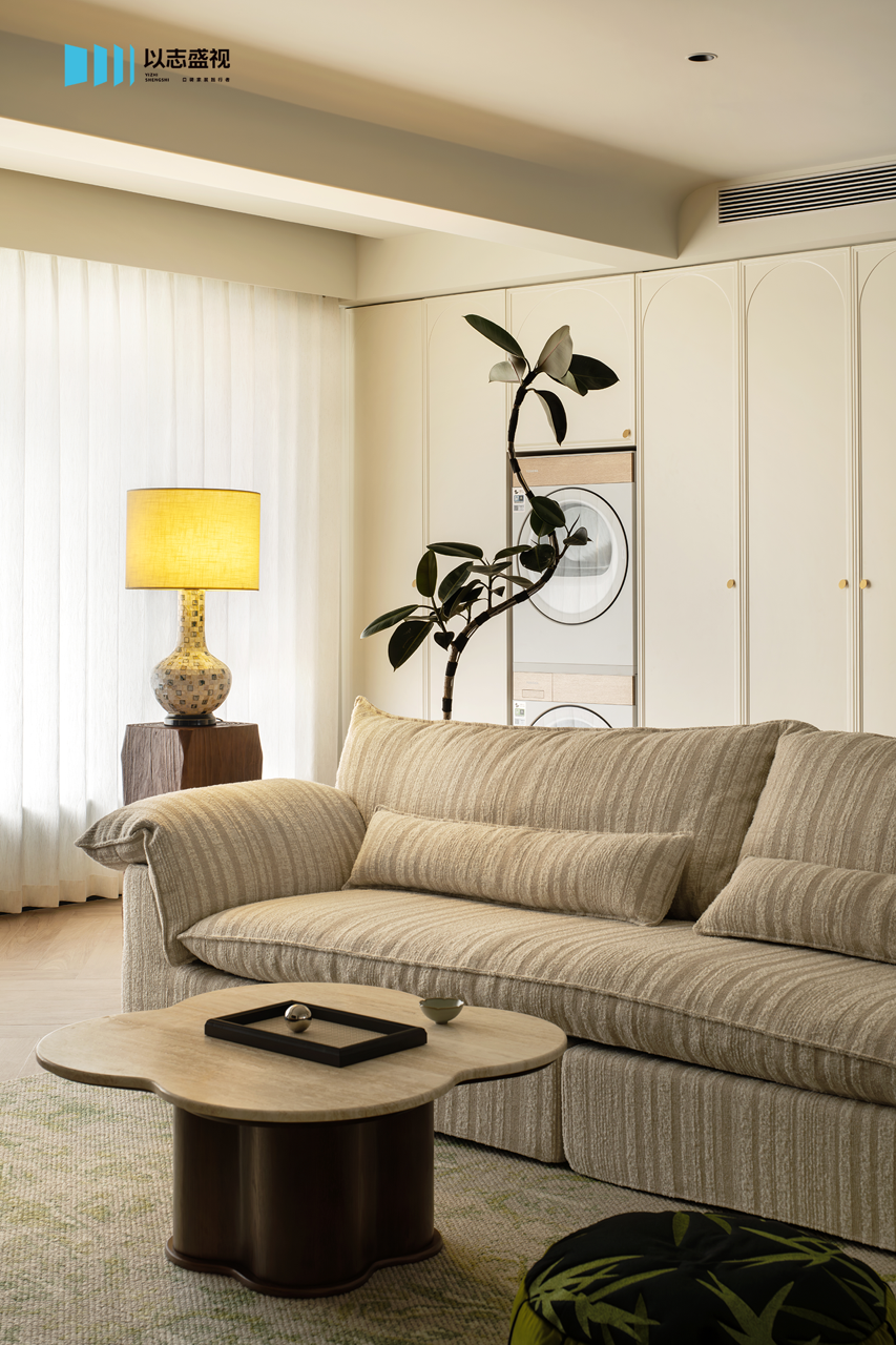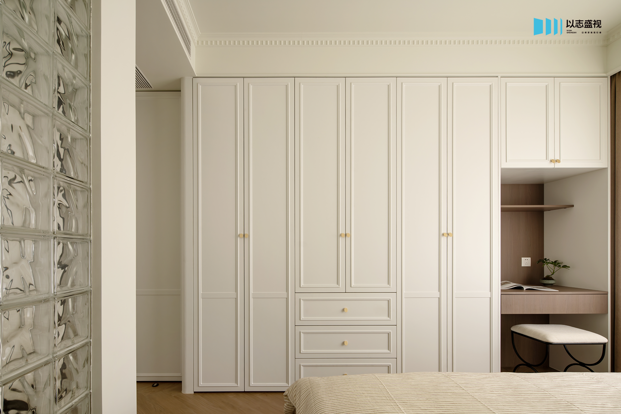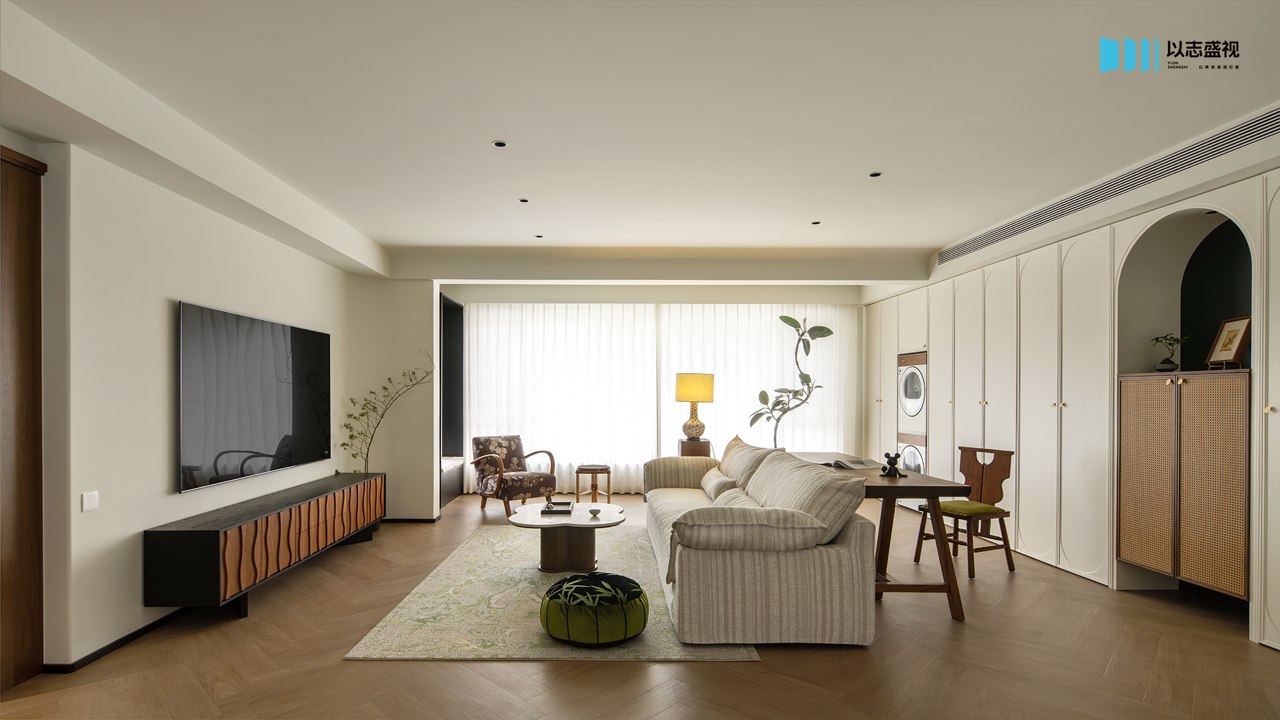 三口人居住的家,需要足够的储物空间与活动公区。我们在玄关补充鞋柜,将次卧入口改为隐形门,整体造型具备视觉延伸感。