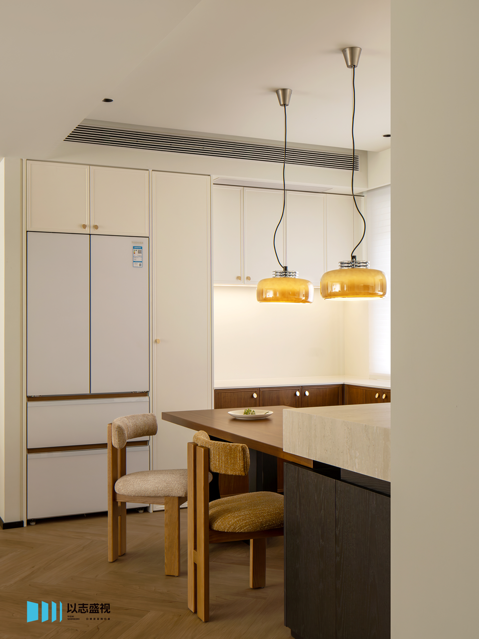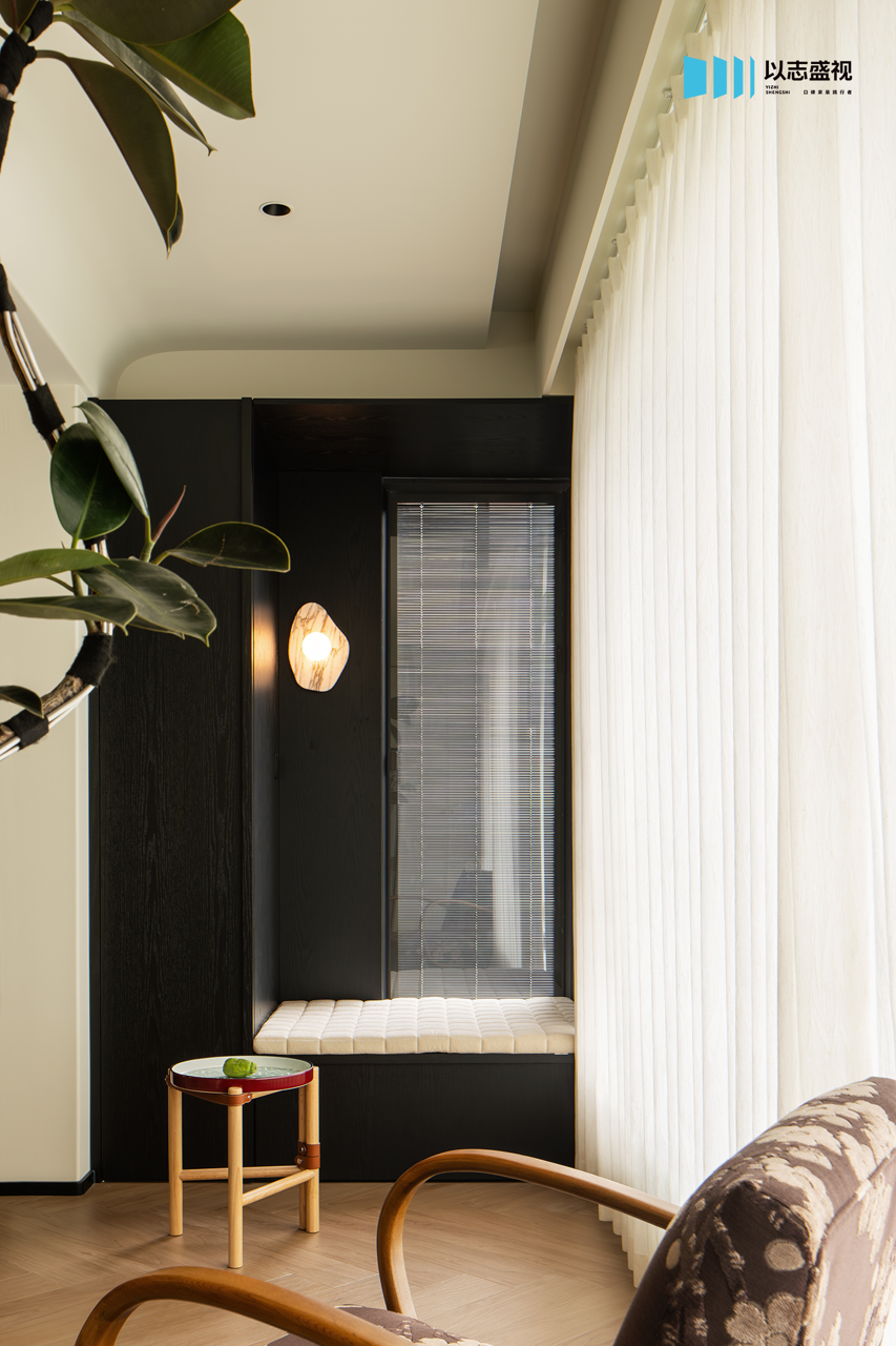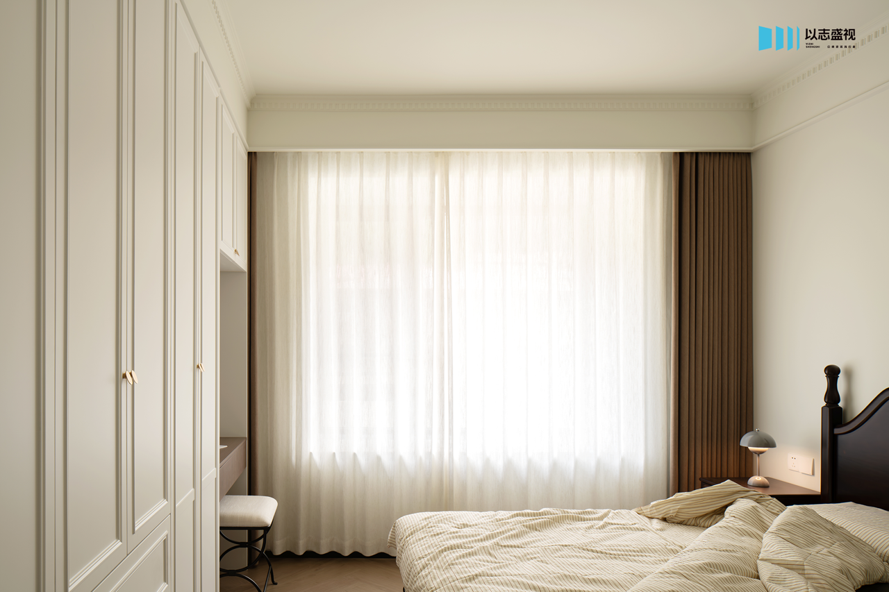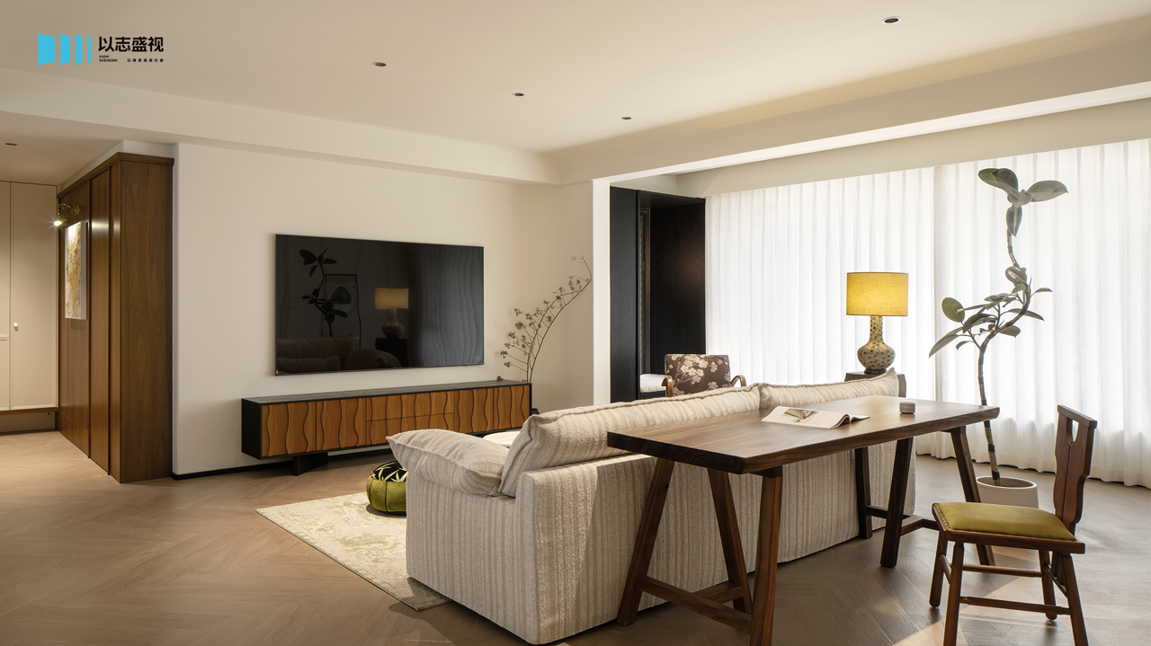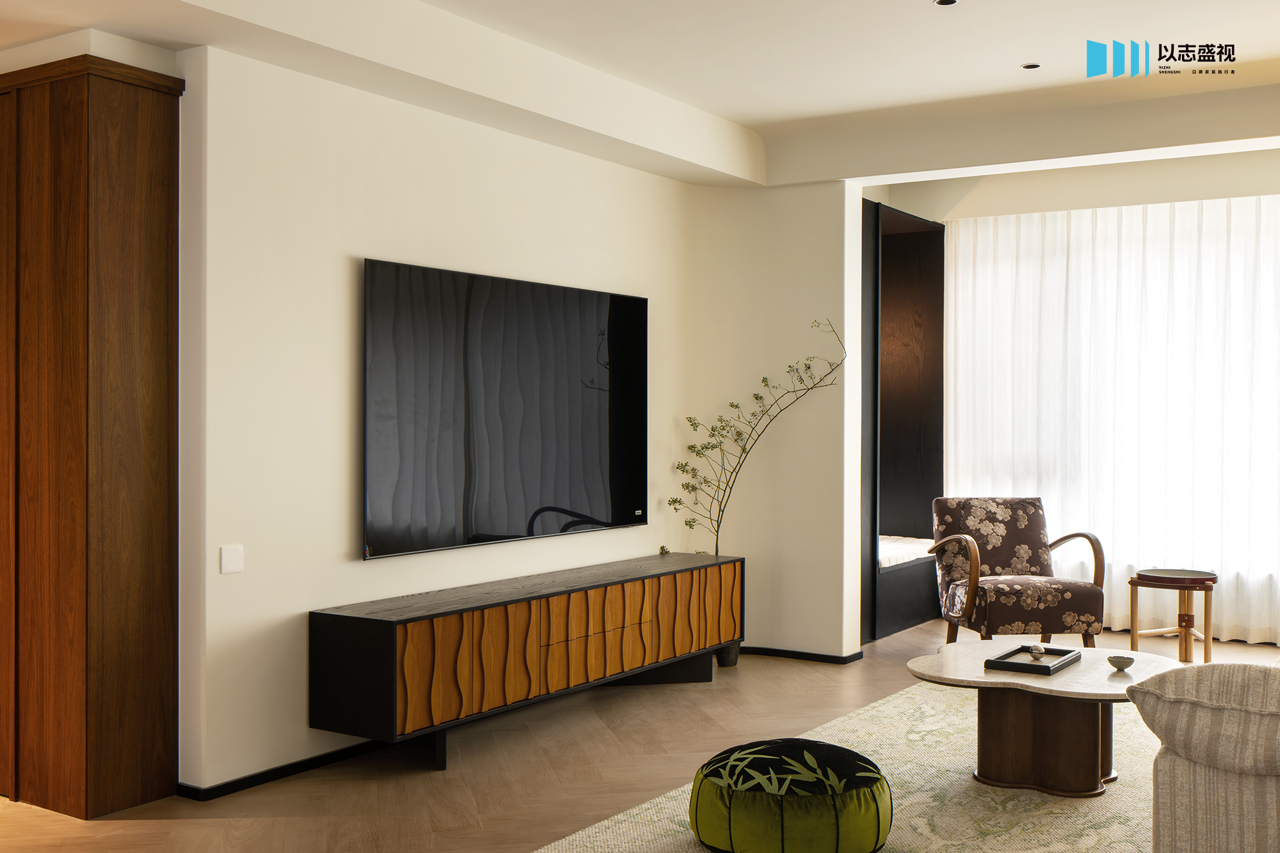 三口人居住的家,需要足够的储物空间与活动公区。我们在玄关补充鞋柜,将次卧入口改为隐形门,整体造型具备视觉延伸感。